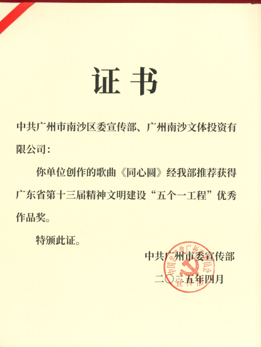 2025年,南沙文体公司在资产经营集团党委的领导下,始终以党的创新理论武装头脑、推动党建品牌建设,深化打造“同心向党 圆梦南沙”党建品牌,以高质量党建引领保障业务高质量发展。主旋律歌曲《同心圆》荣获广东省“五个一工程”奖,实现了政治引领与文化传播的深度统一。